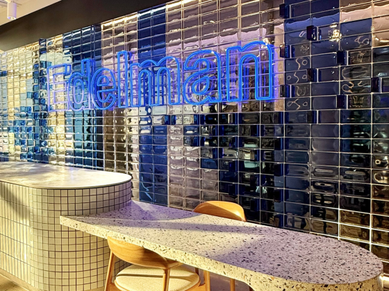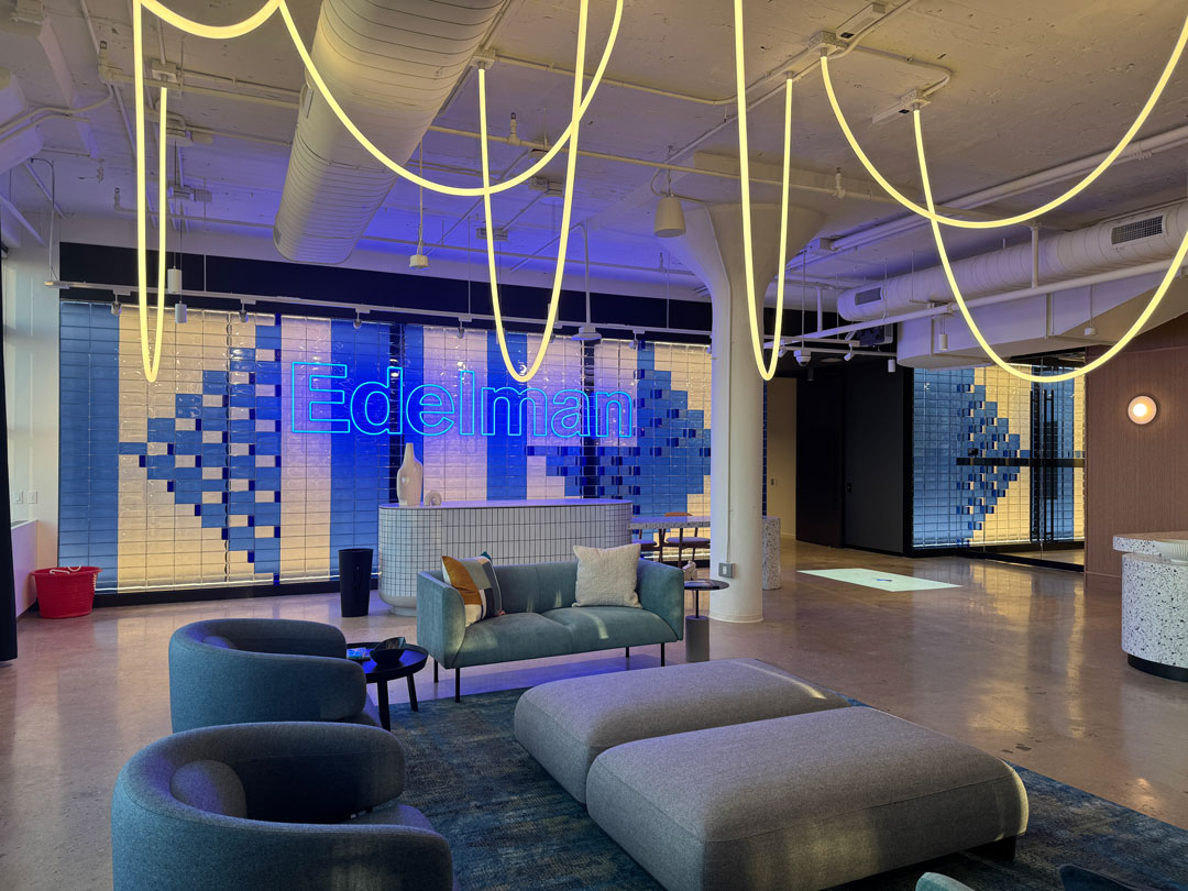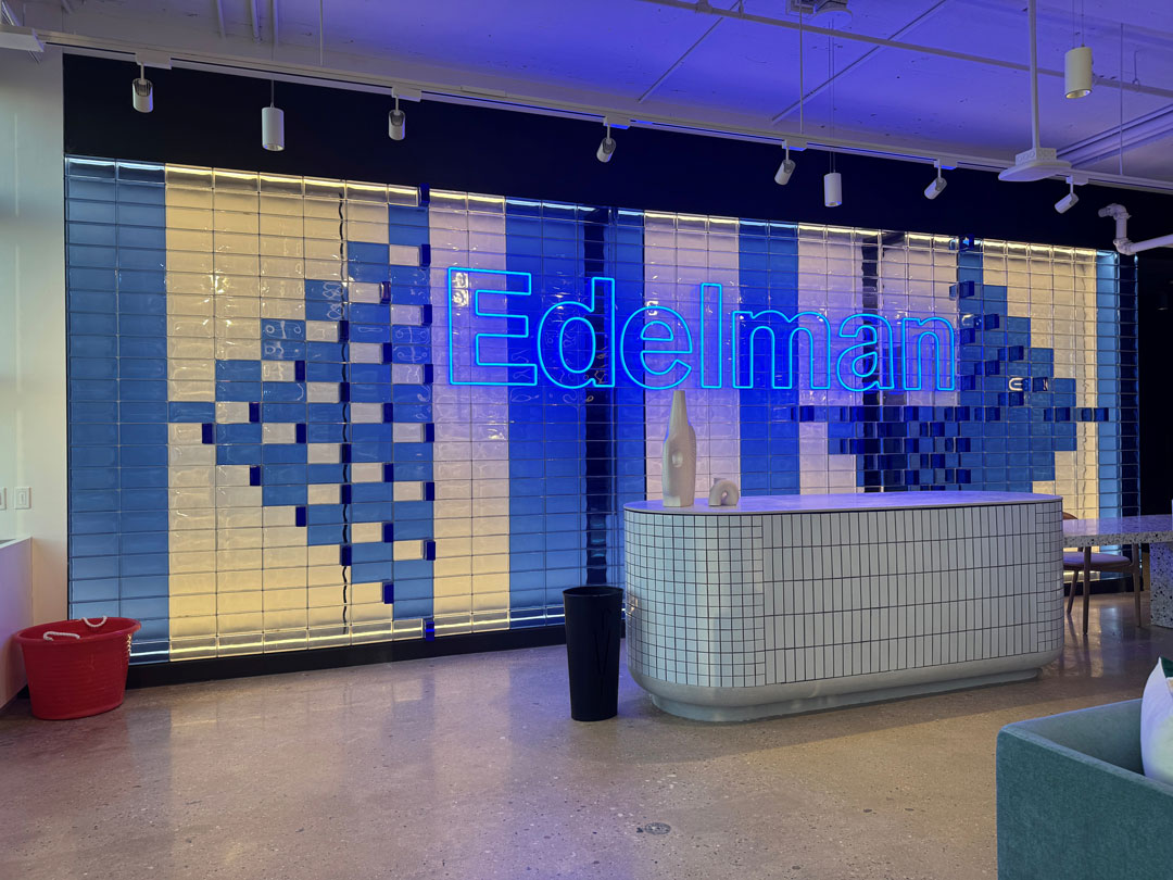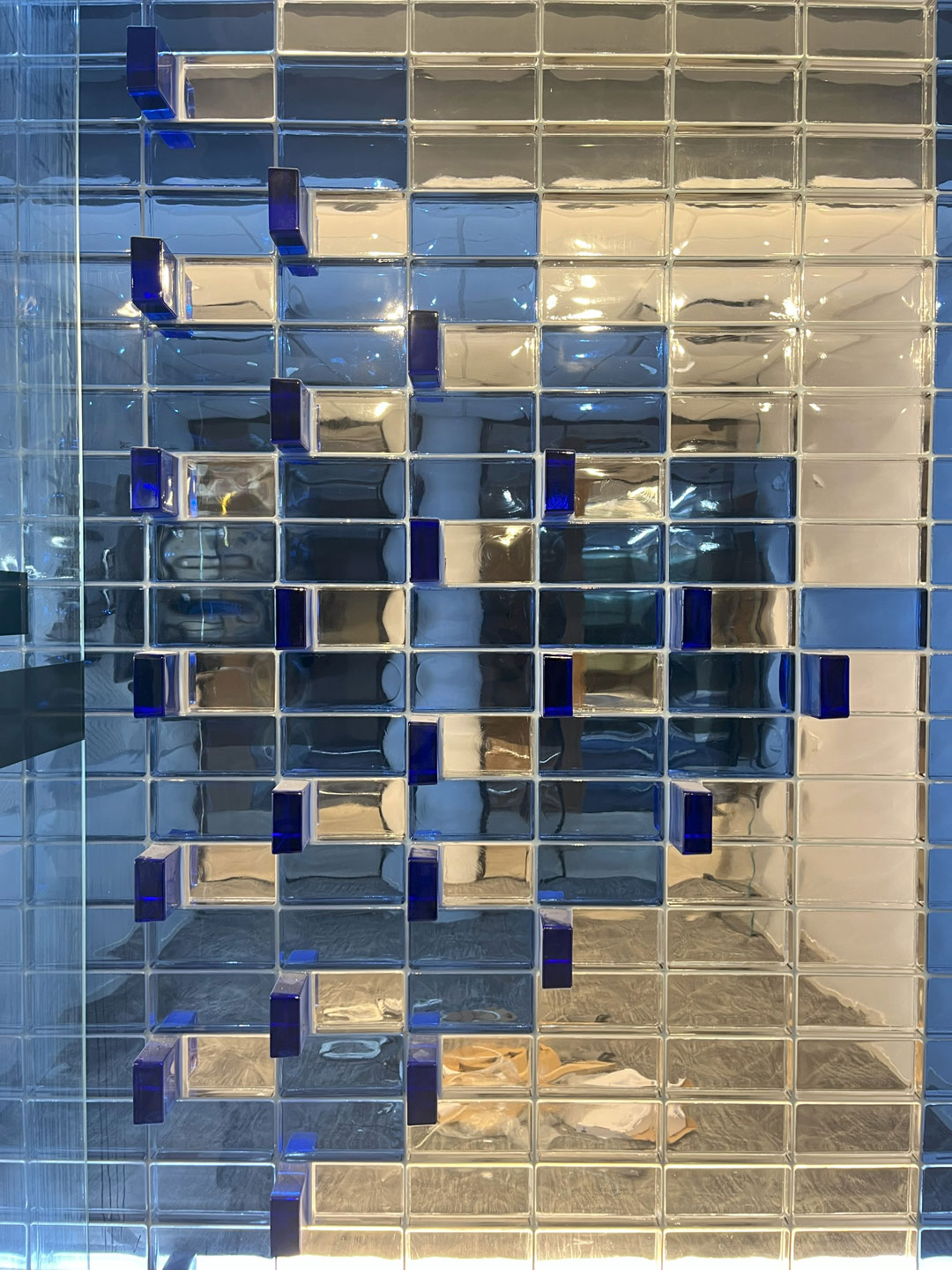 The finished installation achieved a vibrant, light-filled feature wall that serves as a focal point within Edelman’s office. The deep blue glass bricks not only create visual impact but also enhance the ambiance of the space with their reflective and translucent qualities.