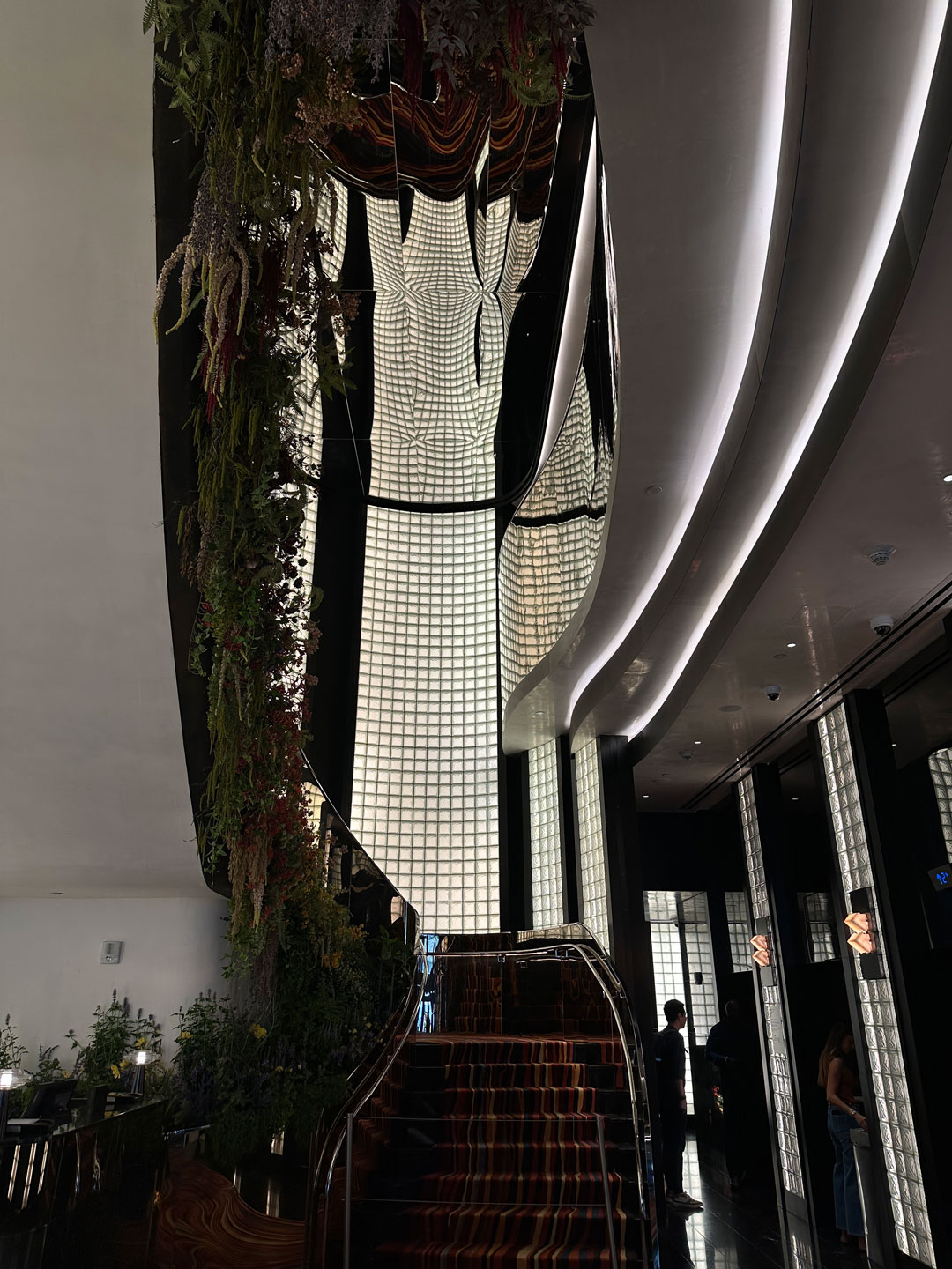 The innovation addressed real architectural challenges beyond aesthetics. Each wall’s unique curve was achieved with meticulously engineered, laser-cut steel grids designed for precise alignment. Foam spacers and structural silicone ensured a seamless “all-glass” look while maintaining strength and durability. Lightweight modular grids, each under 150 pounds, made installation safe and efficient, even in tight spaces behind the staircase. The system also enabled integrated backlighting, transforming the walls into luminous sculptural elements that shift in mood with the lighting design.